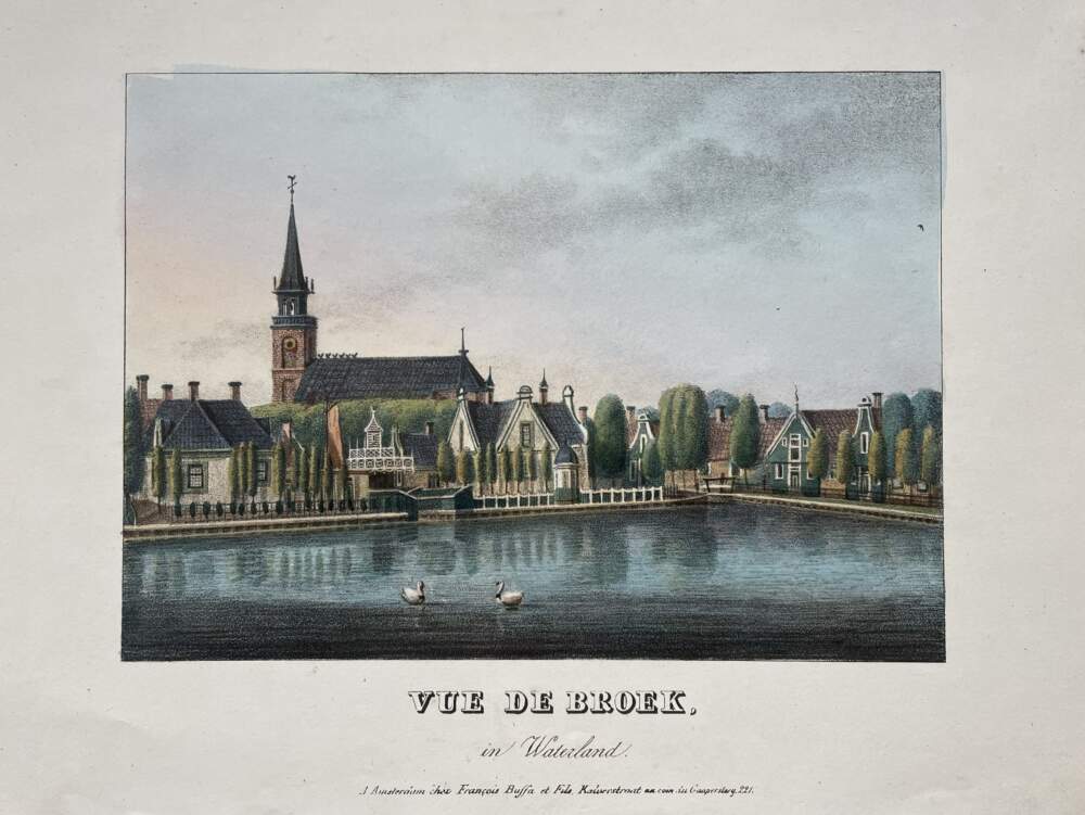 Zeer zeldzaam gezichtje. Mooi groot formaat prent van Broek! Komt zelden binnen! Hier gezien het Havenrak richting het Kerkplein met de Broederkerk.